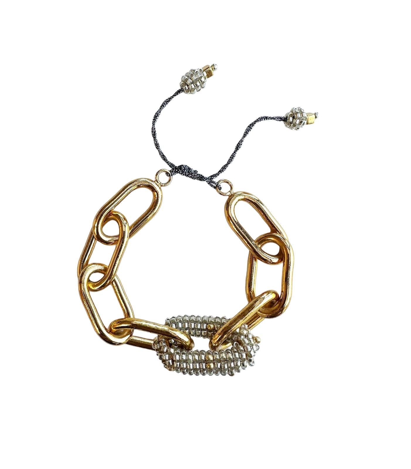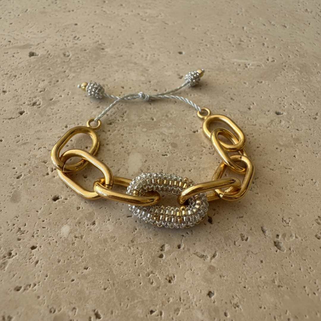 The Liberte Bracelet is the epitome of luxury, handcrafted detail, and uniqueness. This amazing piece is impossible to ignore, showcasing a golden-plated chunky chain with a link meticulously lined with delicas.