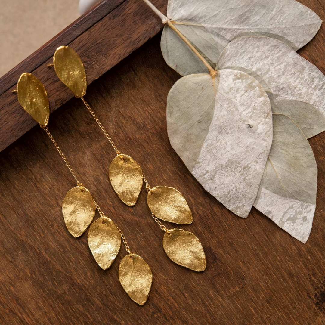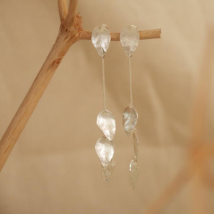 Statement earrings crafted in bronze, featuring eucalyptus leaf motifs, silver-plated, and finished with a matte texture.
