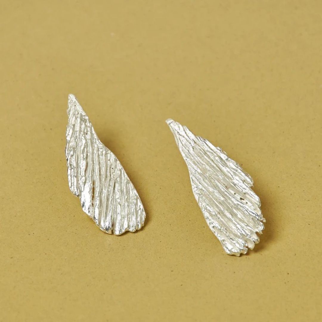Each piece features two pendulum-shaped feathers inspired by the Barranquero (or Soledad) bird.