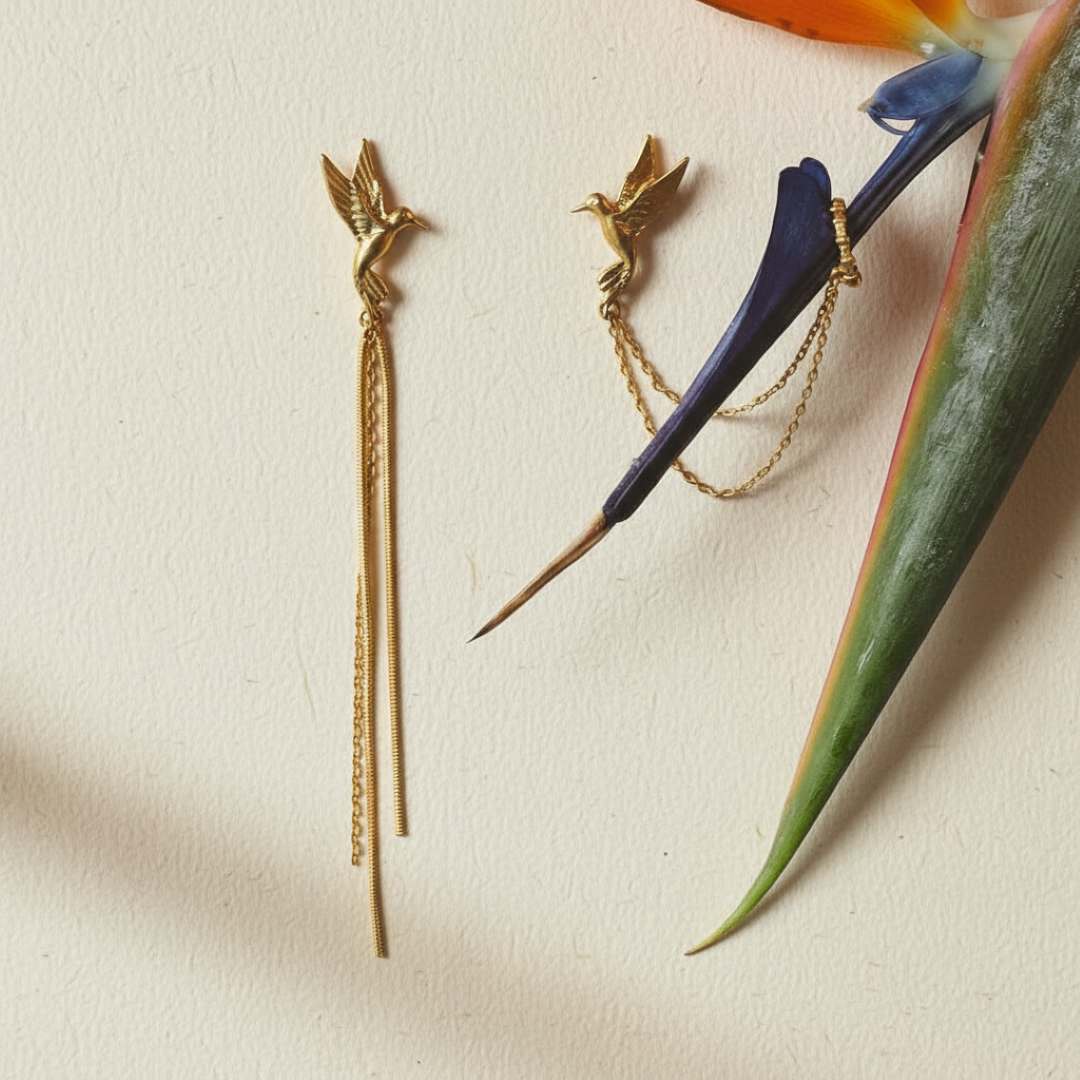 Delicate yet expressive, these artisan-made hummingbird earrings feature cascading gold chains that move beautifully with you. Symbolizing joy and resilience, they’re designed for women who value meaningful details and refined movement. Lightweight, intentional, and made to be collected — not just worn.