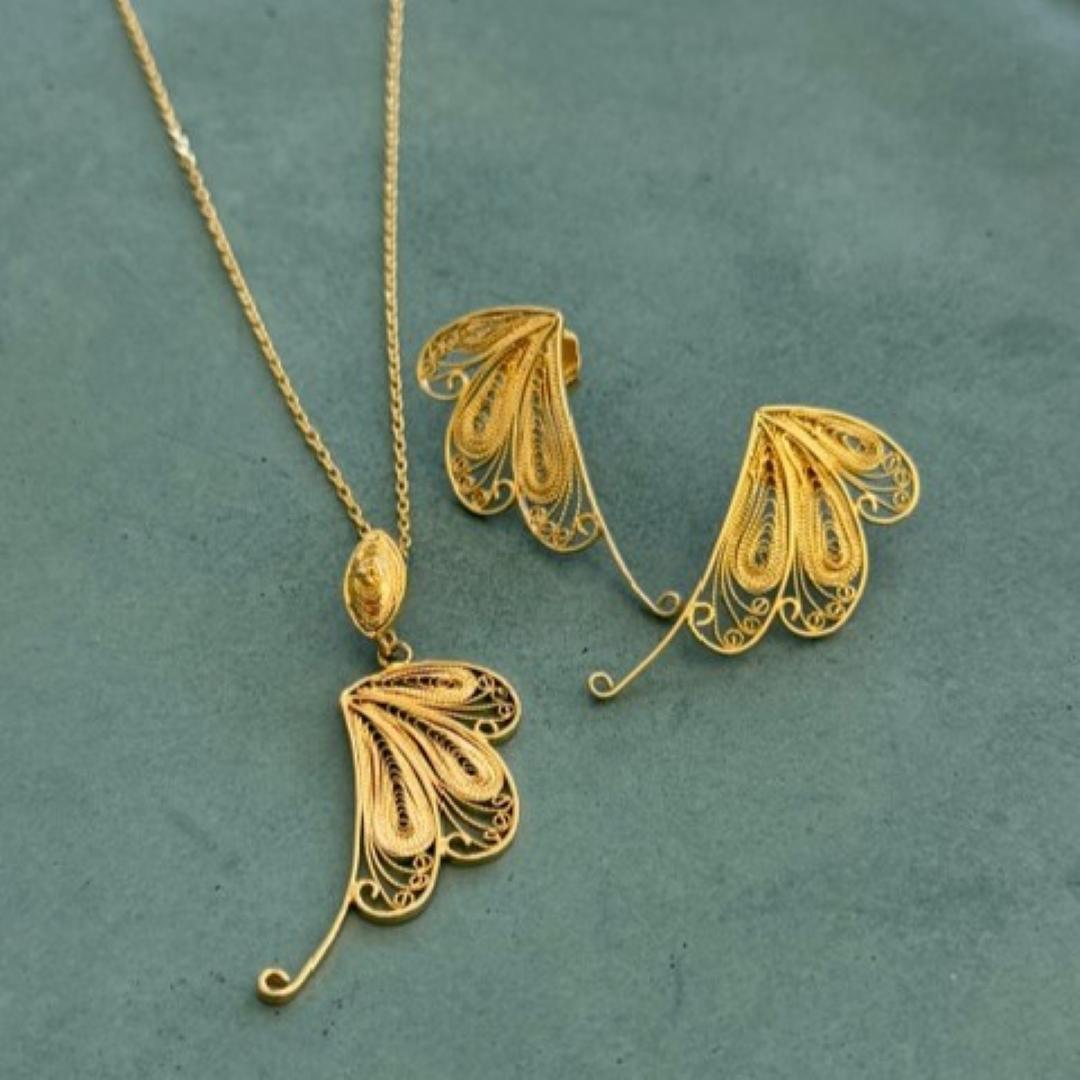 Finely crafted in filigree, in bronze with 24K gold plating. Includes necklace, pendant, and earrings.
