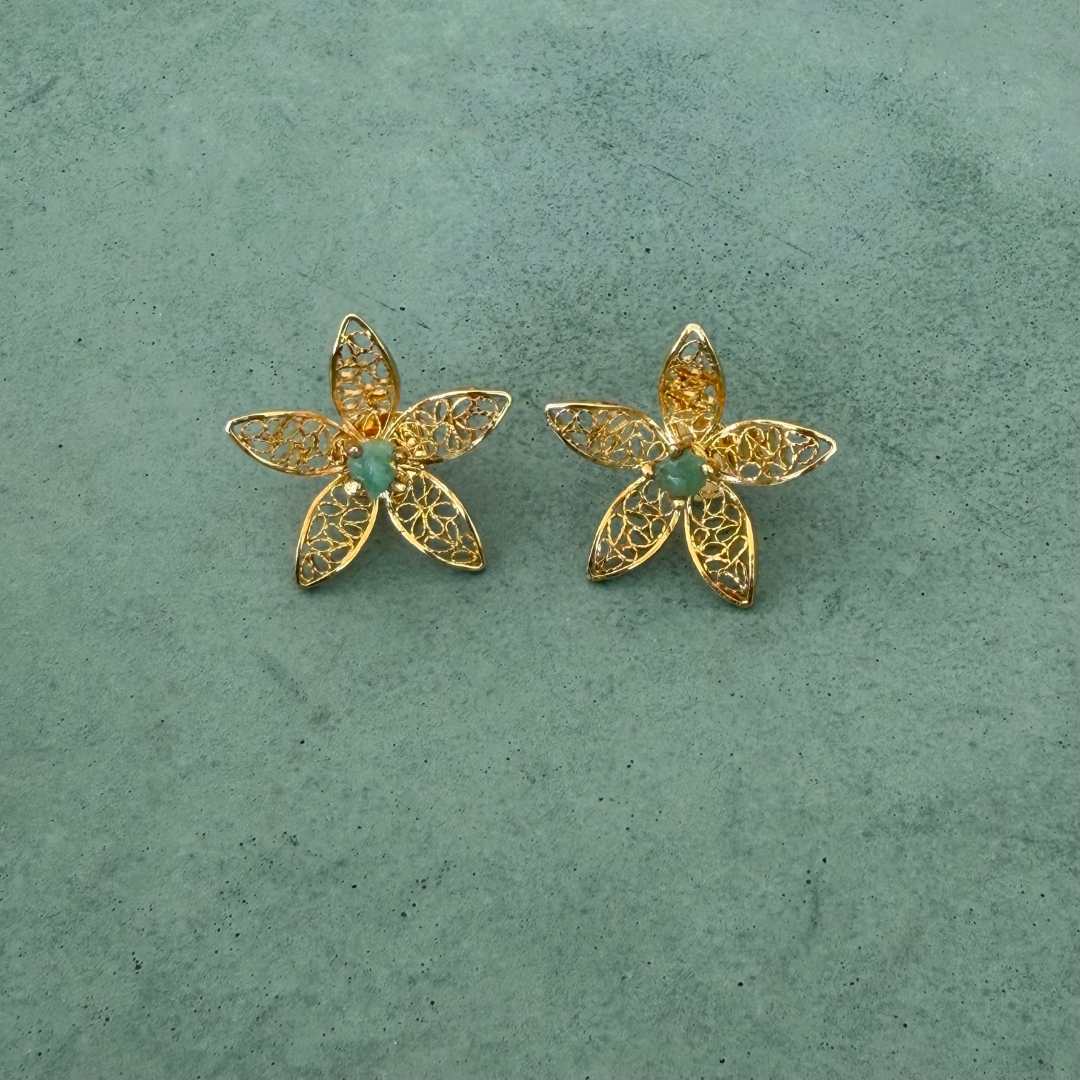 Gold filigree flower earrings, handcrafted in bronze with 24K gold plating and raw Colombian emerald details.