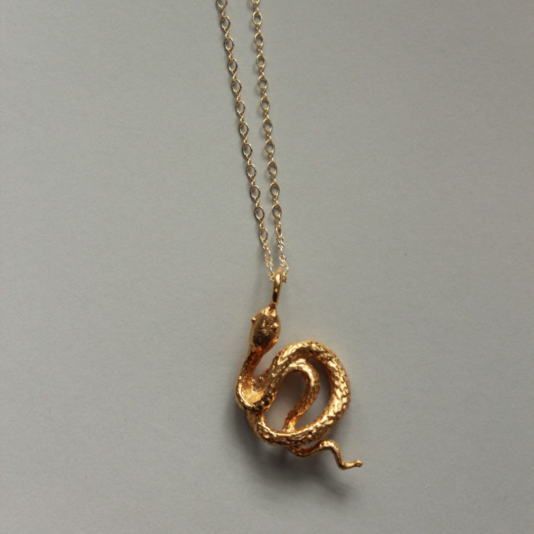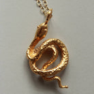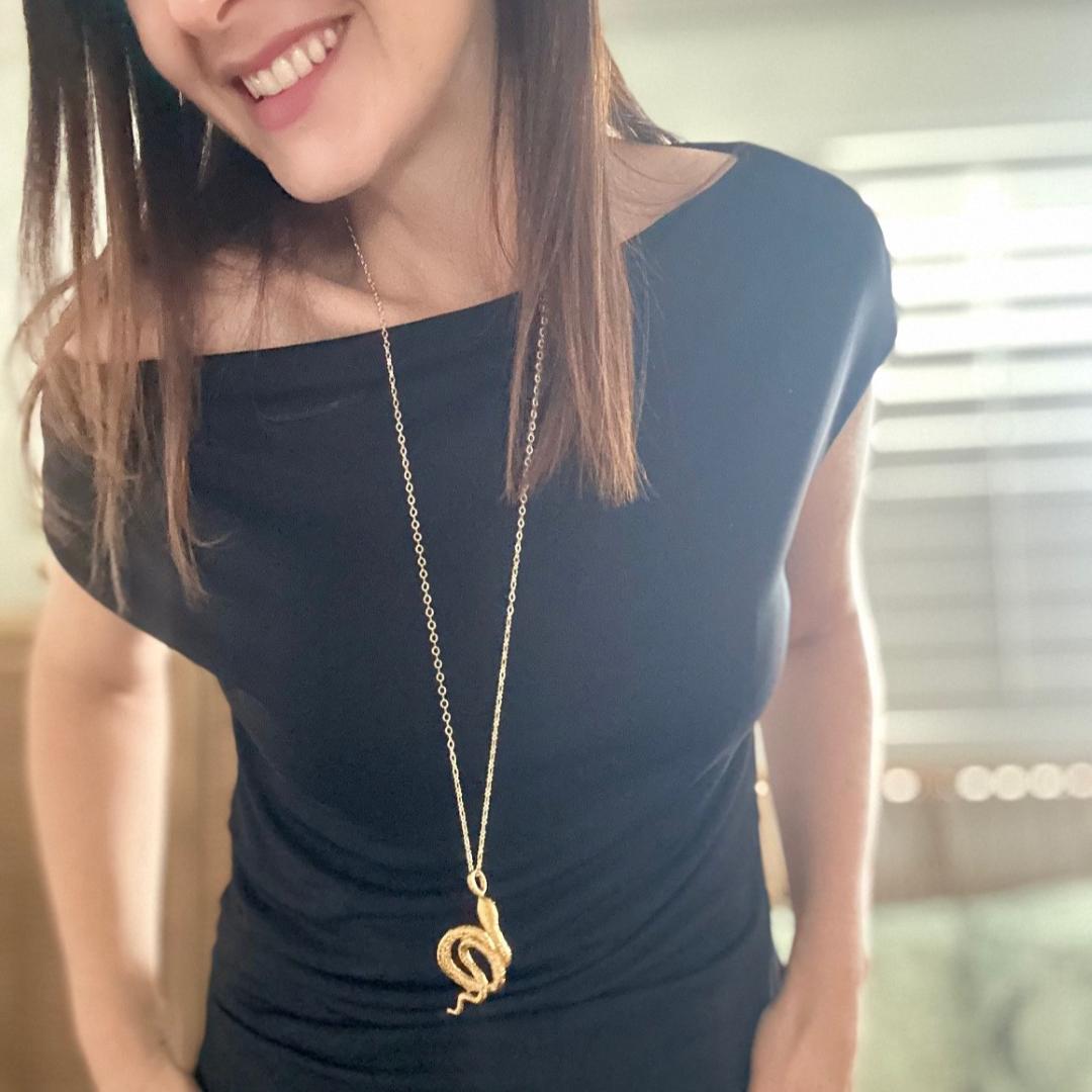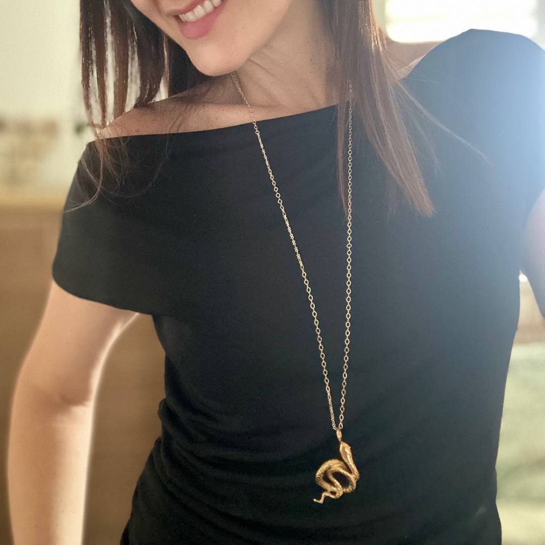 Long Snake Necklace with a gold-filled chain. The pendant is crafted in bronze with 24k gold plating. Nickel free.